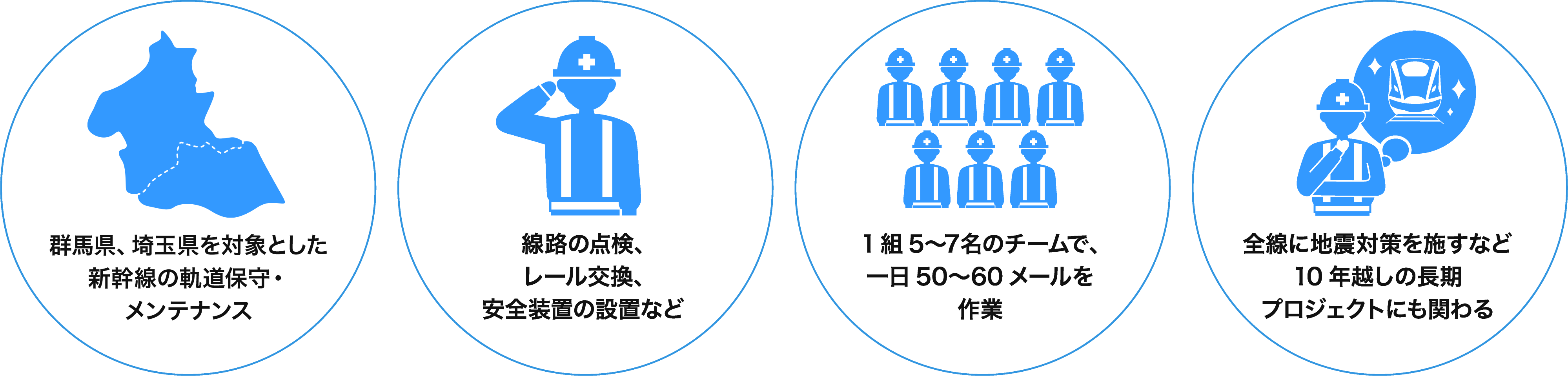 私たちが携わる仕事は、日本が誇る高速鉄道網の安全運行を守ること。新幹線の線路の点検・メンテナンスを中心にした軌道工事を群馬県および埼玉県で手掛けています。1組5〜7名のチームで、作業責任者、列車見張員、器具員数確認者など役割を分担して作業。その結果はJR東日本の検測車「イーストアイ」の診断で確認されます。入社後は年3回の新人教育のほか、安全教育や各種教育訓練のカリキュラムも充実。必要な講習を受け資格を取得しながらスキルを磨き、責任あるポジションへとキャリアアップしていきます。